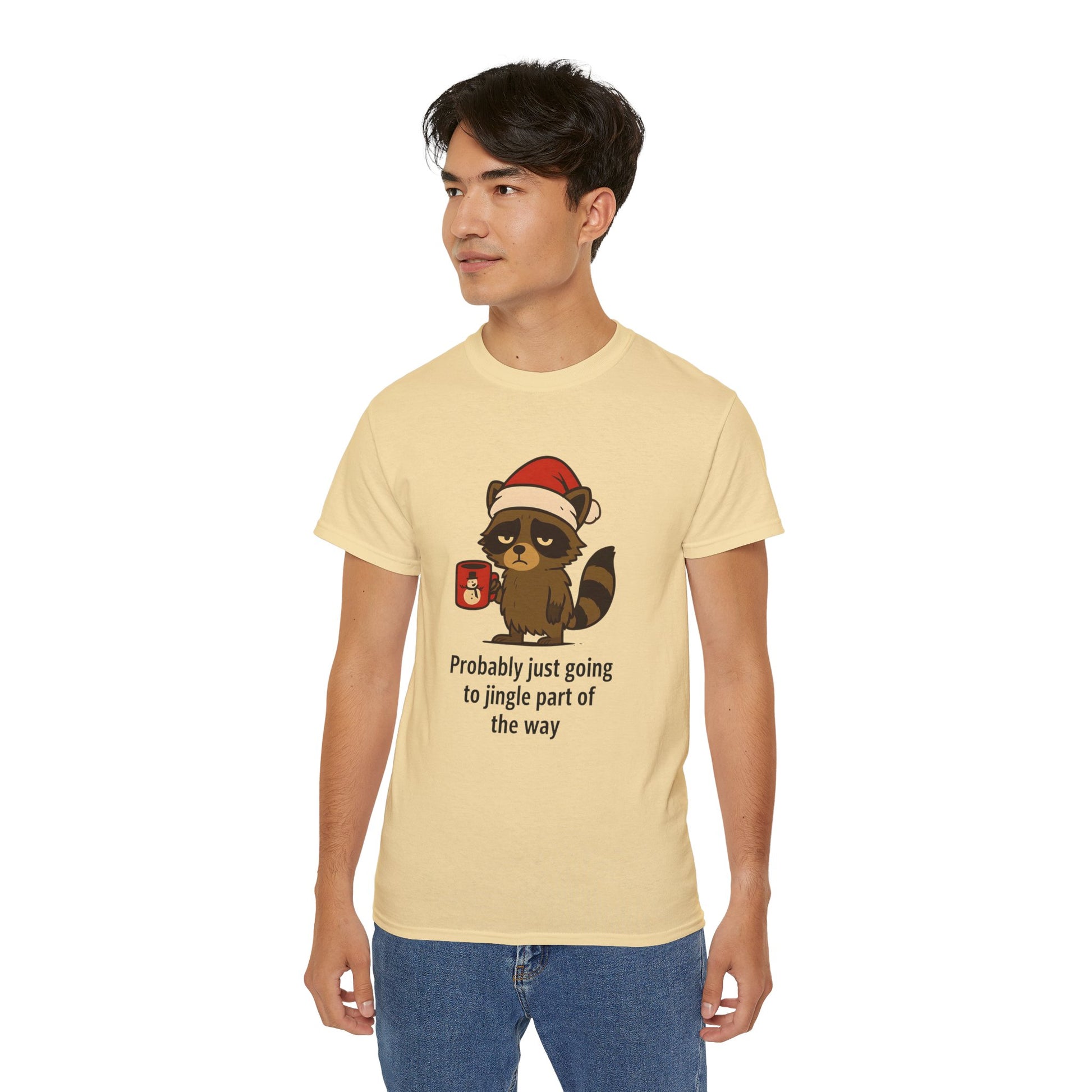 A soft, slightly vintage-feel tee that brings a wink of holiday humor to everyday wear. A sleepy raccoon in a Santa hat cradles a steaming holiday mug above the cheeky line “Probably just going to jingle part of the way,” making this shirt feel like a cozy shrug against frantic festivities. The medium-weight cotton body drapes comfortably and holds shape thanks to a ribbed collar and shoulder tape. Wear it on quiet mornings with coffee, at low-key cookie swaps, or layered under a cardigan during relaxed family gatherings — it reads like a small, familiar joke that sparks smiles wherever you go.