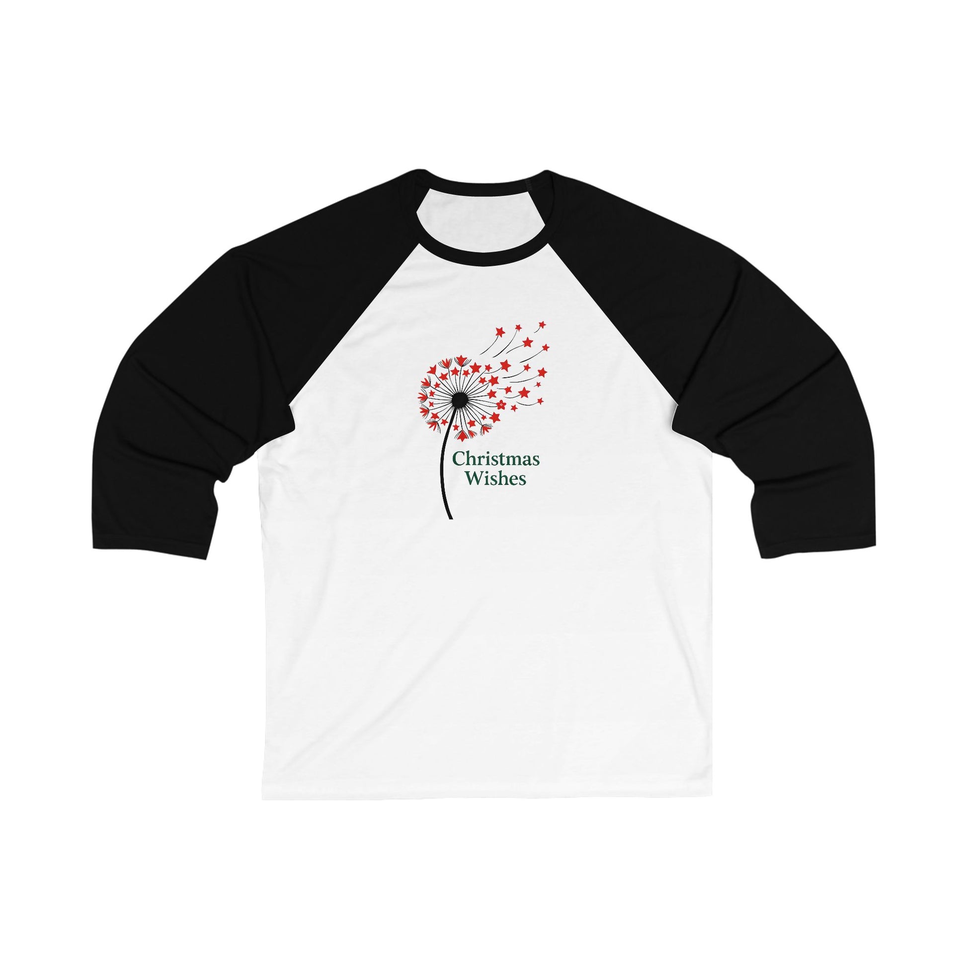 A lightweight 3/4 sleeve baseball tee that brings a gentle, festive touch to casual winter days. The white body and forest-green raglan sleeves frame a delicate dandelion-style graphic made of tiny red stars and snowflakes, with the words "Christmas Wishes" tucked beneath. It feels airy and soft against the skin, with a modern, slightly fitted cut that layers well under jackets or over long-sleeve tees. Wear it to low-key gatherings, tree-lighting walks, or while wrapping presents — it adds a quietly cheerful, handmade vibe without shouting for attention.