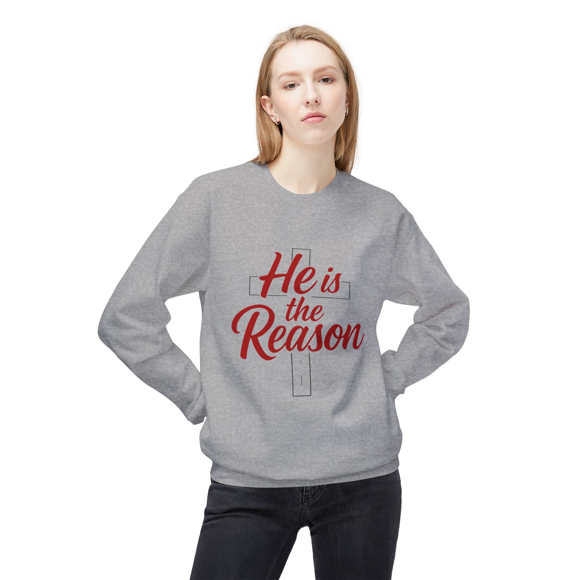 This cozy crewneck brings a quietly hopeful message into everyday wear. The soft midweight fleece and relaxed drop-shoulder silhouette make it feel lived-in from the first pull-on, while the clean front design — a simple cross behind the phrase “He is the Reason” in warm red script — speaks to faith and remembrance without being loud. Wear it to Sunday gatherings, low-key holiday family time, or while wrapping gifts and sipping coffee; it settles around you like a gentle reminder of why you gather. The fabric has a substantial hand that keeps you warm through chilly mornings, and the classic fit layers easily over shirts or under coats. For those who live their faith in ordinary moments, this sweatshirt reads like a small, wearable proclamation: subtle, sincere, and made to be part of regular routines.