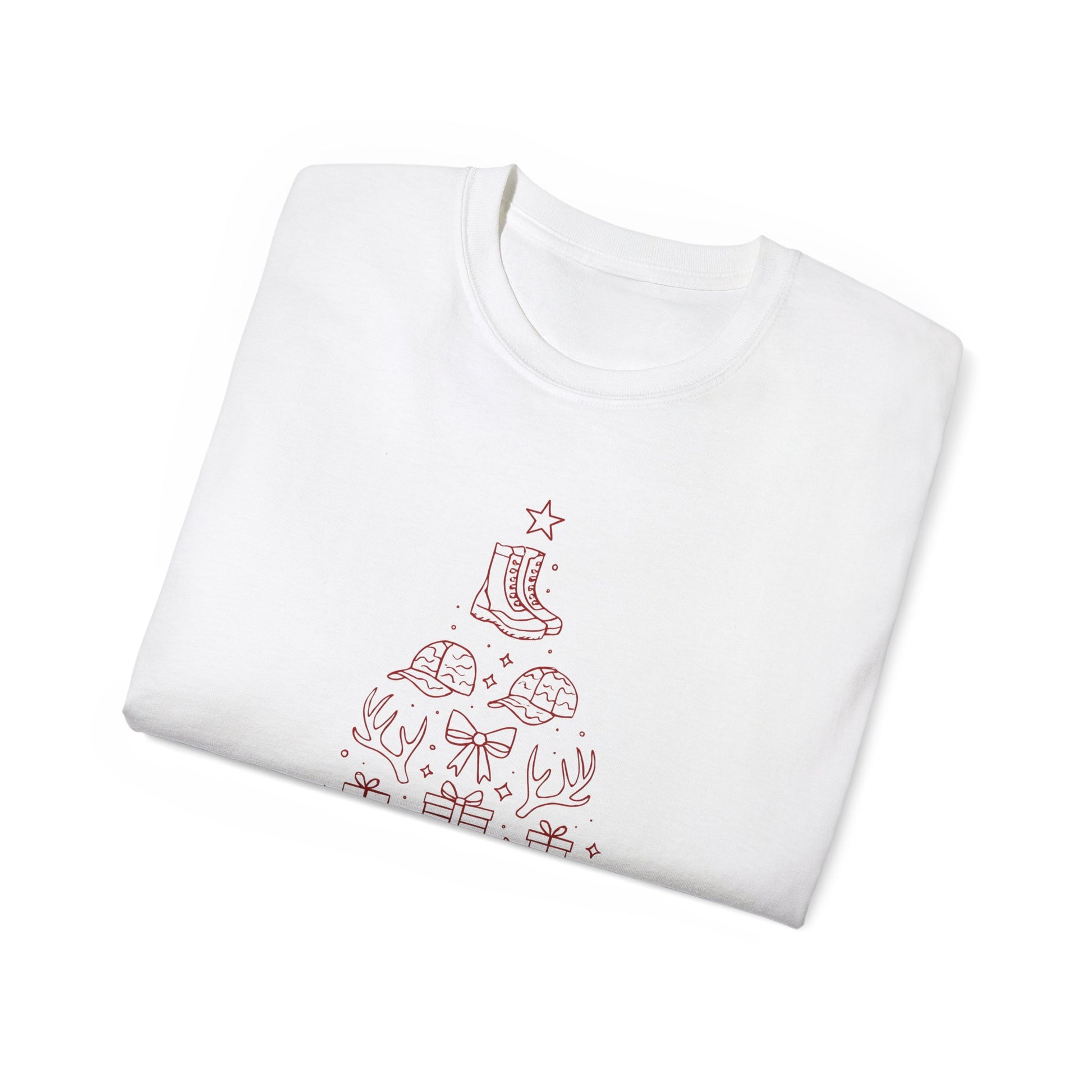 Lightweight, vintage-feel cotton tee printed with a warm, down-home holiday illustration. A simple stacked Christmas tree made from cozy icons — a stocking, mittens, a wreath, wrapped gifts — sits above a friendly “Merry Christmas Y’all” script. The shirt’s soft, slightly thicker cotton and roomy fit make it a shirt you reach for during chilly mornings, crowded kitchens, and relaxed family gatherings. It reads like a neighborhood holiday card: familiar, approachable, and quietly festive without shouting for attention.
